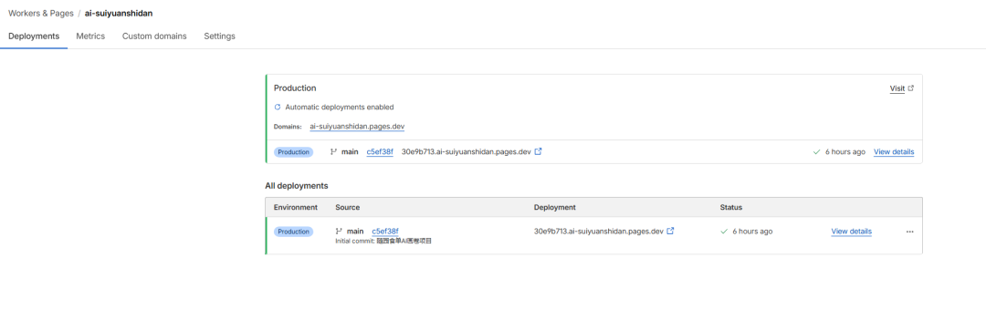 10.将域名绑定到您的网站上。点击Cloudflare 左侧菜单的“Workers & Pages”。点进刚才配置的那个项目(ai-suiyuanshidan)。
