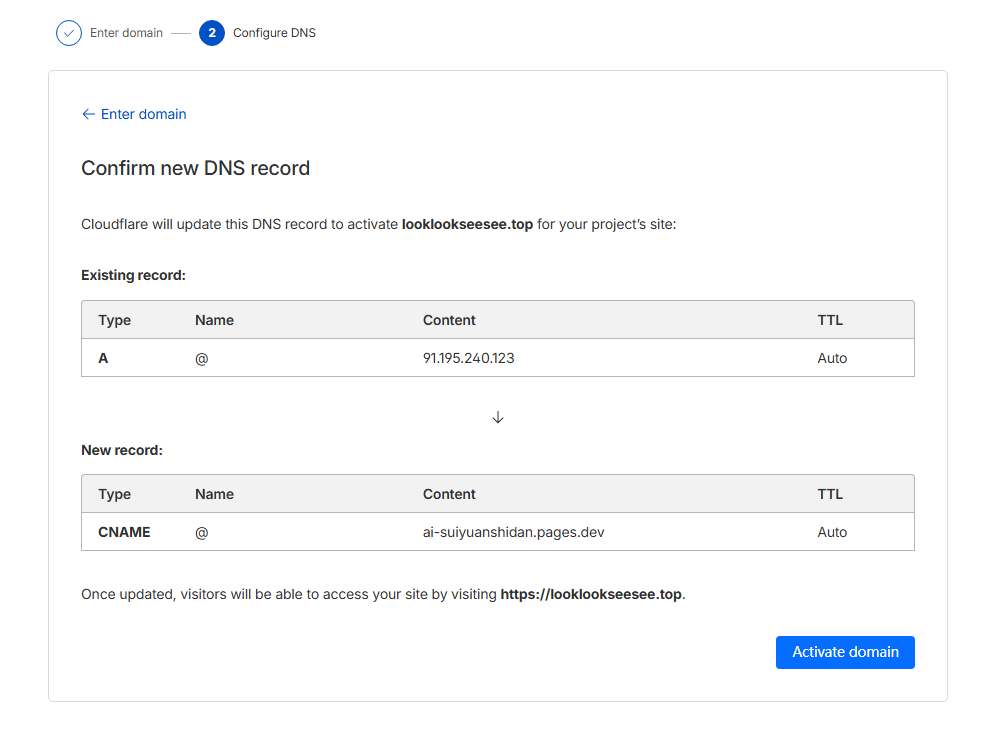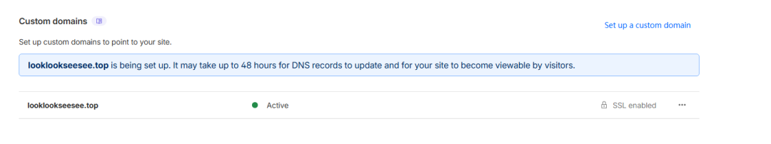点击“自定义域”标签。点击“设置自定义域”。输入新域名(比如yoursite.xyz或www.yoursite.xyz)。点击“激活域名”。因为已经将域名托管给过 Cloudflare 了,所以这里它会自动帮助设置好所有 DNS 记录,不需要手动修改了。等到列表里显示“Active”代表这个网站就成功绑定了我们自己的域名了。