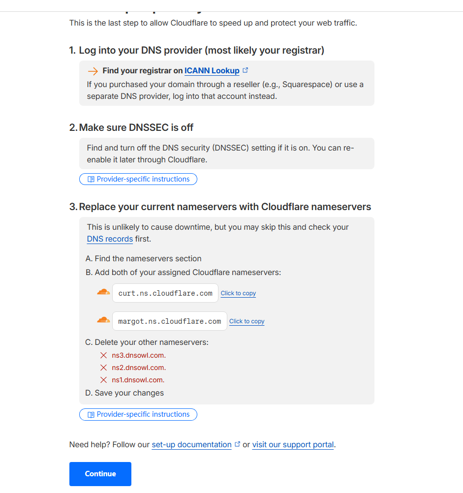 回到刚才那个Cloudflare的页面,点击底部的“Continue”。