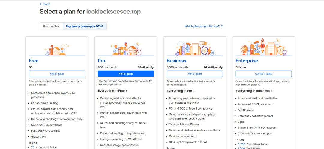 选择套餐:往前,找到“Free” ($0)套餐,点击选中它,然后点“继续”。