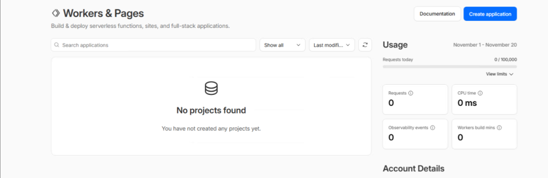 3.进入 Cloudflare 控制台,选择Create application(创建应用)。