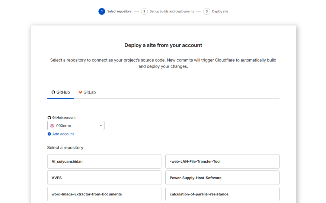 7.部署。在 Cloudflare 授权完成后,在Cloudflare的页面里你会看到你的 GitHub 仓库列表。找到刚刚创建的仓库:点击 Begin setup。