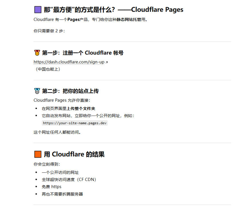 “我现在是一个小白 ,完全不懂网络知识 ,我现在想把AI写的一个静态网站发布为人人都可以访问的网站, 我听别人说用CF最方便 。帮我解释下具体什么意思啊”