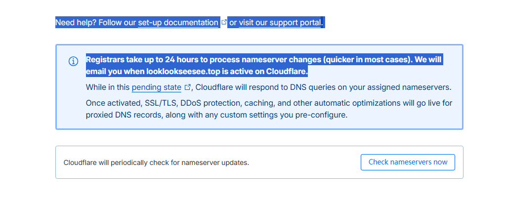等待生效:这一步l理论需要三十到几小时(全球 DNS 刷新),但正常都是实时生效。当您 Cloudflare 发来的邮件说“Active”,或者在 Cloudflare 首页看到您的域名变成绿色对勾时,就说明托管成功了!这步操作的本质上就是把域名的管理权(托管服务器商)从域名管理商那里改成cloudflare了。