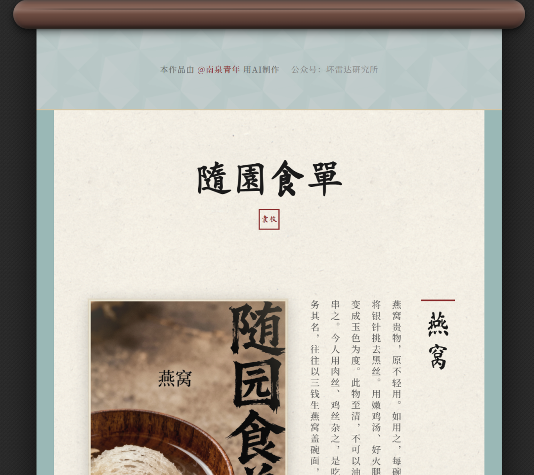 前段时间,我用 AI编程 做了一版《随园食单》的展示页我用AI又把《随园食单》印到了画轴上,效果好得让我惊了一跳。那一刻我突然很想把这个小网页作品“上线”,让更多人看到AI + 文化的乐趣。