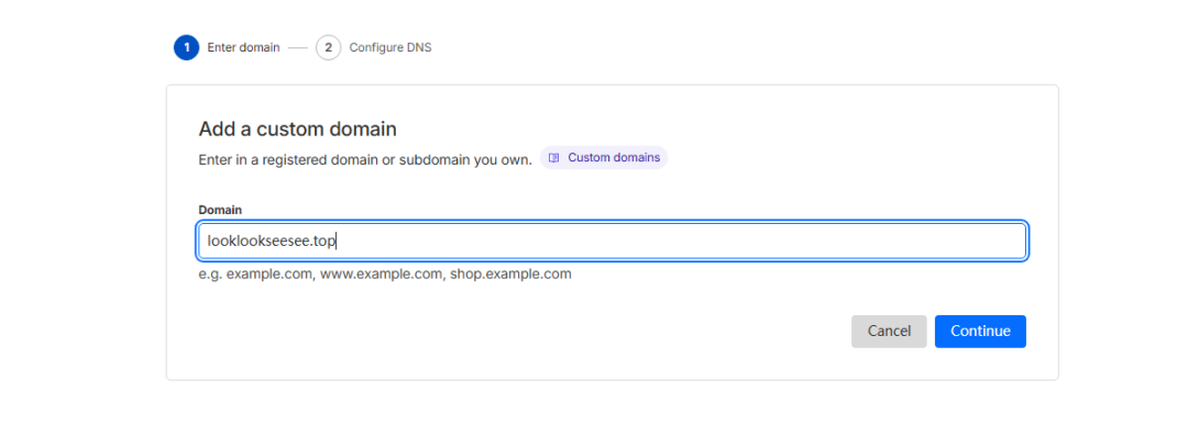 输入您刚才购买的域名(比如yoursite.xyz,注意不要带www或http),然后点“继续”。
