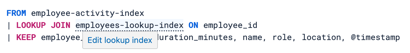 直观的工作流程: Discover的全面自动补全功能将引导您完成流程,在ES|QL编辑器中建议查找索引和连接字段,使您能够轻松地将上传的数据与现有索引连接。输入不存在的查找索引的名称,然后单击即可直接访问查找编辑器创建索引。输入现有查找索引的名称,我们将建议编辑选项: