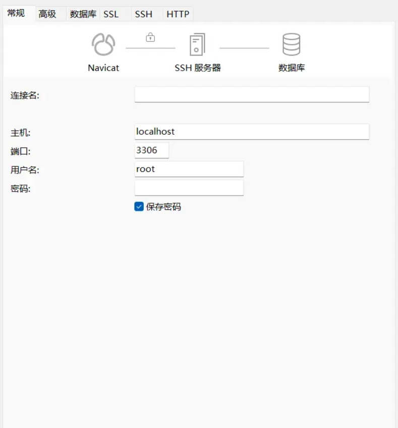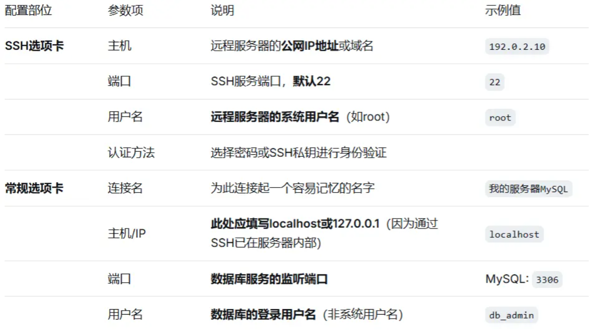 主机名/IP地址:此处非常重要。因为此时连接已经通过SSH隧道“进入”了远程服务器,所以应填写服务器本地的数据库地址,通常是 localhost 或 127.0.0.1 。(许多初学者误填服务器公网IP会导致连接失败)