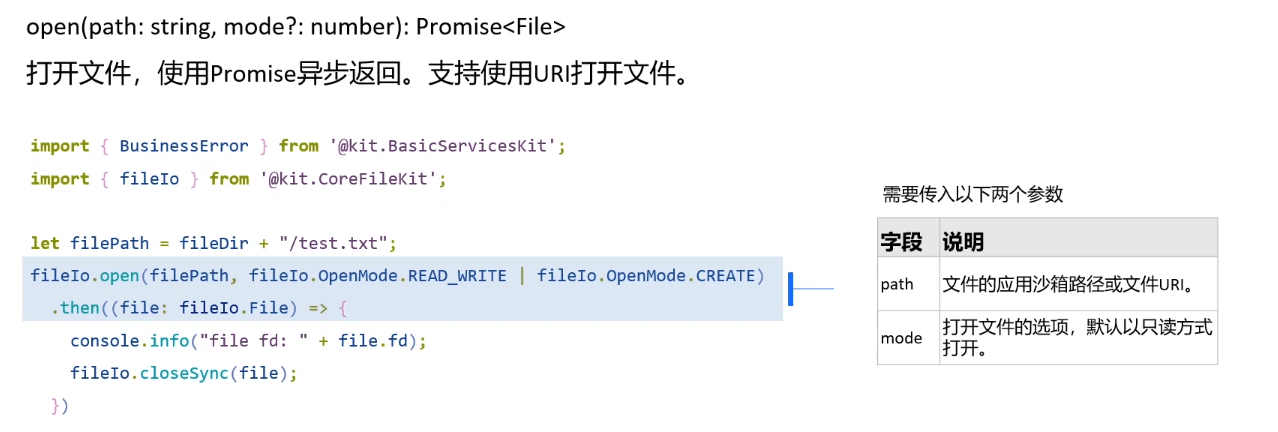 打开文件的官方逻辑是用的open函数,上文中我使用的是异步处理,但是也是open的函数操作,能看到我提供的代码是使用的openSync,其实操作是一样的,我最终是写入,官方示例是打开后进行了关闭,中间输出了一下控制台信息。