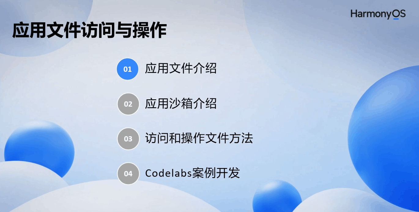学习HarmonyOS的朋友们有福了,今天我在官网看到HarmonyOS第一课课程中的中级课程内有一篇【文件访问与操作】的课程,我跟着学习了一番,发现相当的好啊。整个分为四个部分,下图中可以看到,我们主要学习的是第三个部分的访问和操作文件的方法,之前我对文件操作的时候其实还是很模糊的,就是对json文件进行读写操作,还是在网友帮助下搞的一个固定写法,后来发现了这个,后面对文件的操作就有规范性指导意义了。