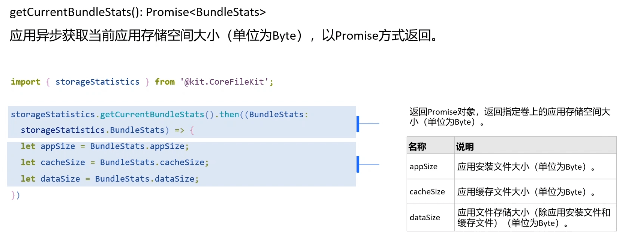 这里可以通过getCurrentBundleStats函数来直接获取当前应用的存储空间大小,分别是安装文件大小,缓存文件大小,应用文件存储大小三个信息,这三个信息在我们做文件判断的时候很重要,下载的进度条也需要根据这个来判断。