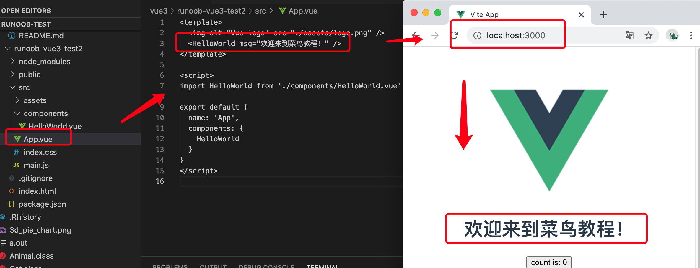 接下来,我们以 runoob-vue3-test2 为例,打开目录下的 src/APP.vue 文件,代码如下(解释在注释中):