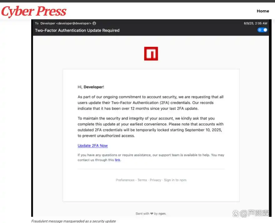 攻击始于一封主题为“Two-Factor Authentication Update Required”的邮件,发件人地址为support@npmjs[.]help。该域名于2025年8月底注册,明显模仿官方域名npmjs.org,属于典型的“typosquatting”变体。邮件正文声称:“为符合最新安全策略,您必须在24小时内更新双因素认证设置,否则账户将被暂停。” 此类紧迫性语言是社会工程攻击的经典话术。