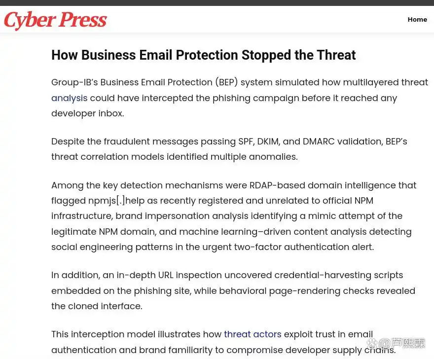 2025年9月的NPM钓鱼事件揭示了一个关键事实:在高度自动化的软件供应链中,人的环节——尤其是通过邮件进行的身份交互——仍是薄弱点。本文通过技术复盘证明,攻击者利用邮件认证机制的语义盲区,成功实施账户接管。然而,先进邮件防御体系通过融合域情报、行为分析与上下文理解,可在投递阶段有效阻断攻击链。