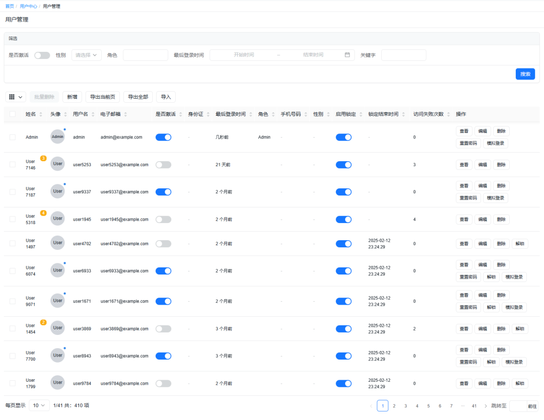 public class UsersController : ApiControllerBase { ... }fa-users)PermissionCodes.UserManagement与RBAC模型自动关联,实现按钮级权限控制