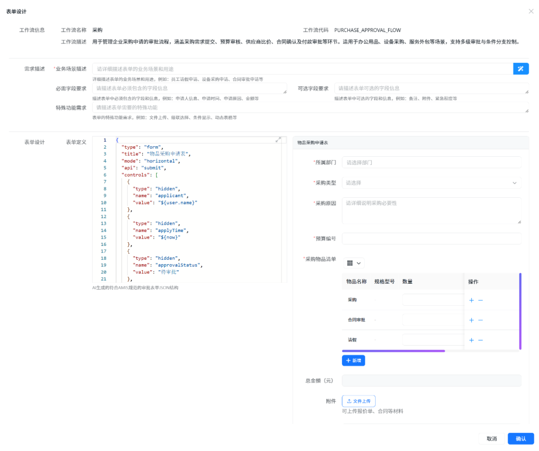 [Description("AI生成的符合AMIS规范的审批表单JSON结构")]
