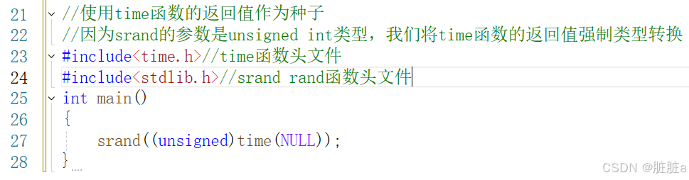 void srand (unsigned int seed)程序在调用rand函数前先调用srand函数,通过srand函数的参数seed来设置rand函数生成随机数的时候的种子,只要种子在变化,每次生成的随机数就在变化。