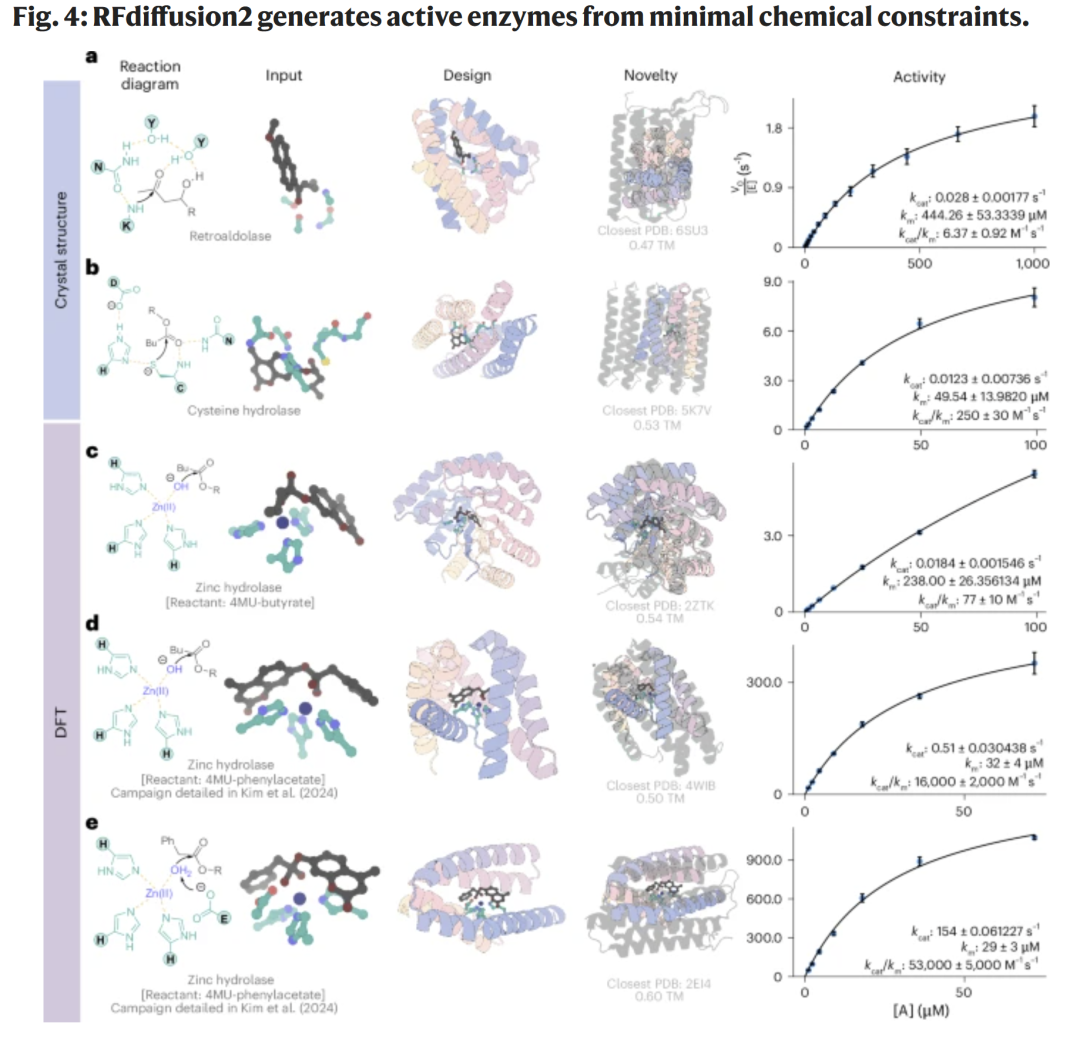 研究人员选择了五类反应(retro-aldolase、cysteine hydrolase、三类 zinc hydrolase),其中三类完全基于 DFT 计算生成过渡态几何,不依赖天然酶模板。