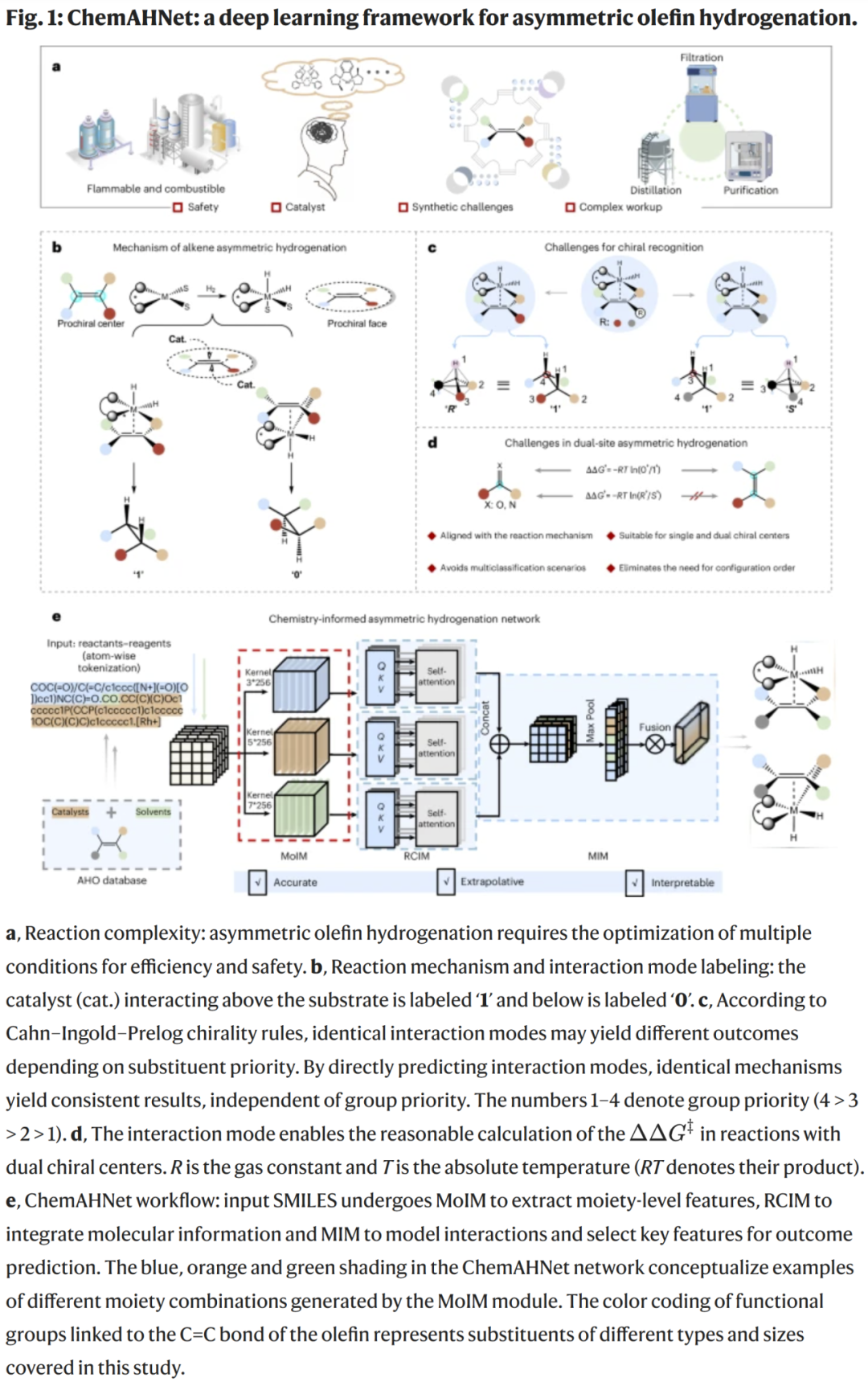 不对称加氢是最重要的手性构建反应之一,但现有机器学习模型通常仅适用于单一前手性位点,难以跨底物–催化剂体系泛化,且无法同时预测双前手性烯烃的立体选择性与绝对构型。研究人员提出 ChemAHNet,一个基于不对称加氢机理构建的深度学习模型,通过三个结构感知模块,从 SMILES 输入中自动捕捉原子级空间与电子相互作用。该模型能够准确预测多类催化剂与底物体系中的主要对映体绝对构型,同时通过催化剂–烯烃的相互作用模式计算立体选择性,避免传统 R/S 标记的歧义。ChemAHNet 无需量子化学描述符,具有良好的外推能力,并可推广至其他不对称催化反应,为面向目标的分子设计提供多尺度结构特征洞察。