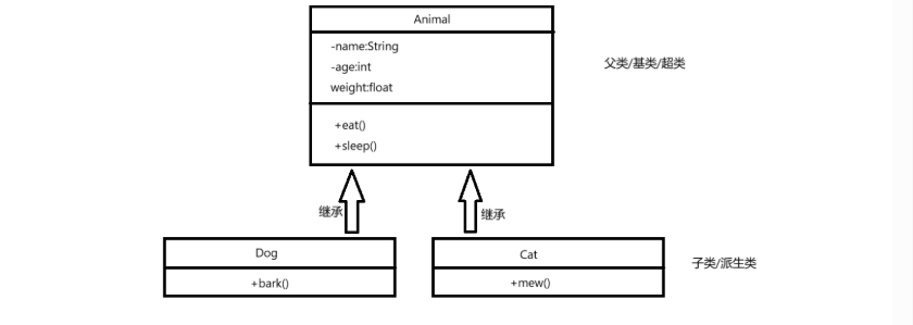 上述图示中,Dog和Cat都继承了Animal类,其中:Animal类称为父类/基类或超类,Dog和Cat可以称 为Animal的子类/派生类,继承之后,子类可以复用父类中成员,子类在实现时只需关心自己新增加的成员即可。