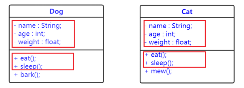 }通过观察上述代码可以发现,猫和狗的类中存在大量重复,如下所示: