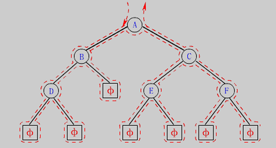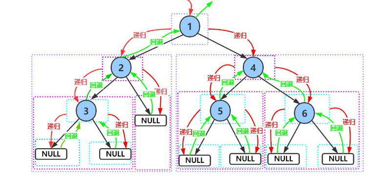 }下面主要分析前序递归遍历,中序与后序图解类似