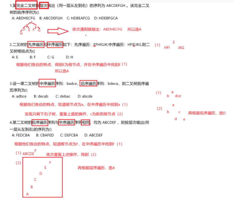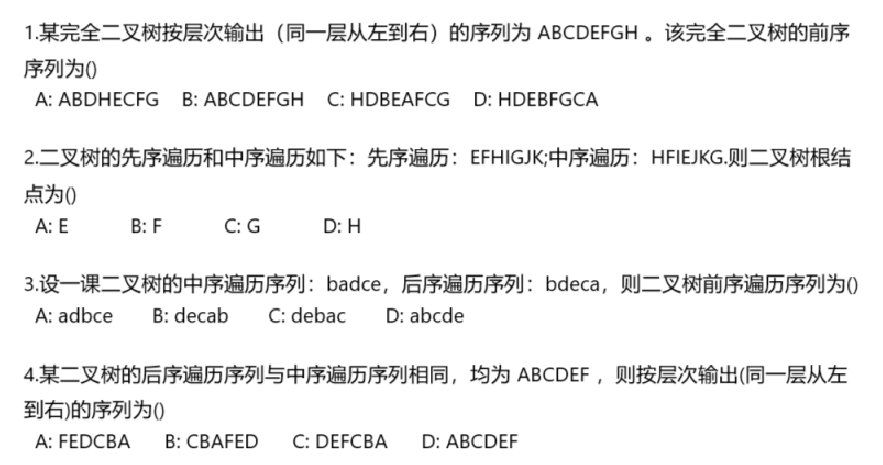 (1)自己去多找几个二叉树的图片,分别写出对应的前中后序遍历