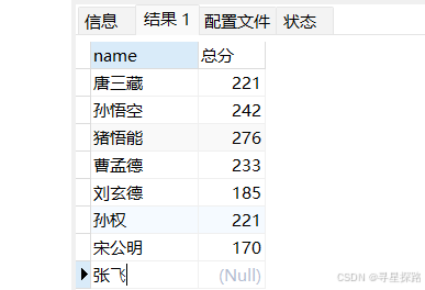 select name, chinese + math + english as 总分 from exam;