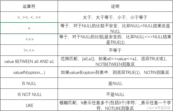 条件查询执行过程: 1)遍历这个表的每一行数据~~ 2)把这一行数据, 代入到条件中 3)如果条件成立(true),此时把这个行加入到结果集合中,如果条件不成立(false),这一行直接跳过 4)当完成所有的遍历过程之后,此时得到了结果集合,还需要根据 select 指定的列/表达式/别名/去重操作 5)再针对结果集合做进一步处理~~