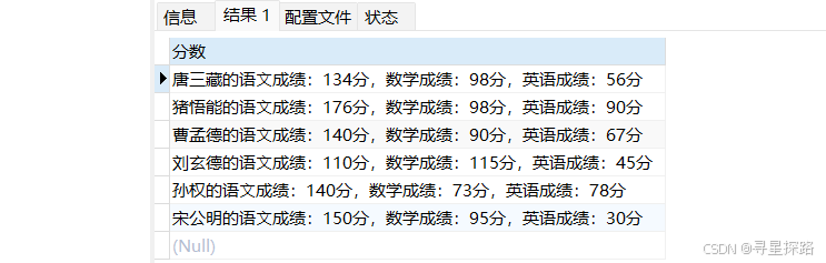 select concat(name, '的语⽂成绩:', chinese, '分,数学成绩:', math, '分,英语成绩:', english, '分') as 分数 from exam;