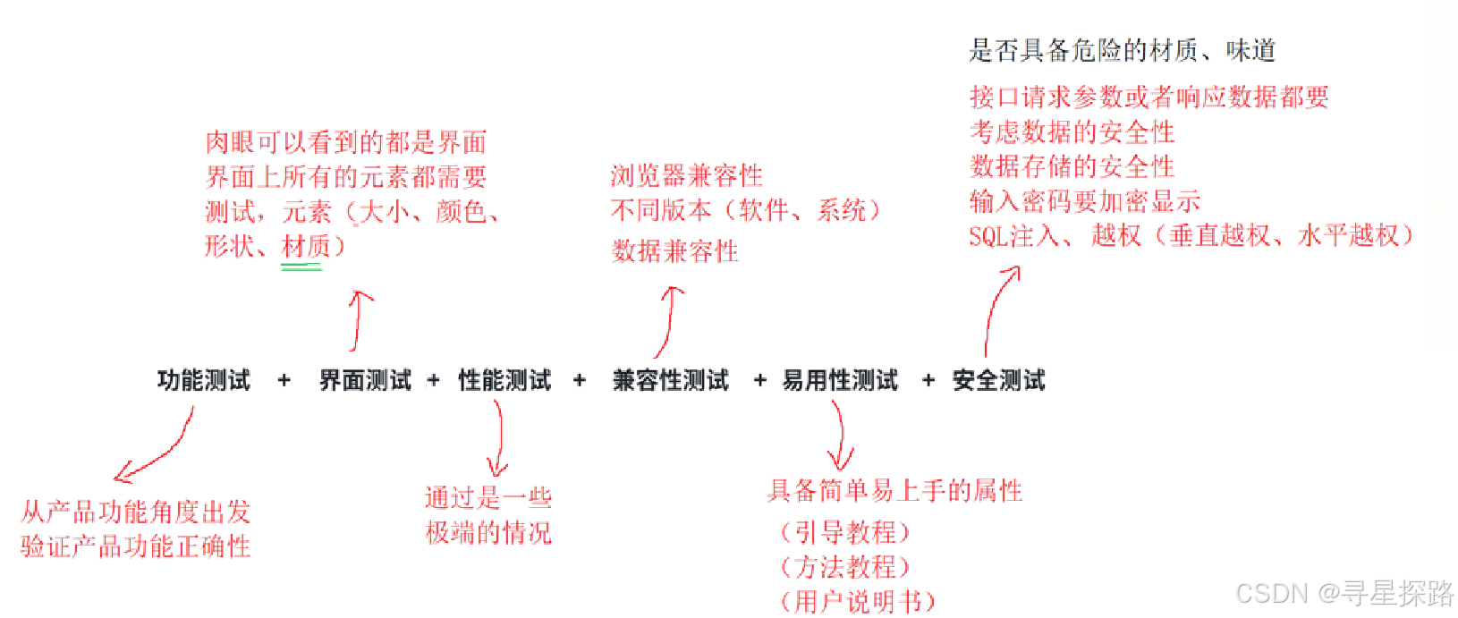 功能测试 功能测试是一个试图发现程序与其外部规格说明之间存在不一致的过程。外部规格说明是一份从最终用户的角度对程序行为的精确描述。功能测试通常是一项黑盒操作。在进行功能测试时,需要对规格说明进行分析以提炼测试用例,本课程中讨论的具体设计测试用例的方法尤其适用于功能测试。 然而,不仅是工作中还是面试中,可能会存在需求不明确的功能?这种情况下该如何进行功能测试? ◦ 查找其他相关文档,来帮助理解所要测试的产品需要完成的目标; ◦ 尽量多参加项目组内的会议,比如需求讨论、设计讨论、计划讨论等,能够加深对产品的理解; ◦ 召集相关人员,对你整理的结果进行讨论,通过评审后,这份文档就可以作为依据来设计你的case了; ◦ 如果是一款已经上线的产品,可以多使用产品,有不懂的问产品经理; ◦ 也可以去看历史bug,可以了解到一些需要关注的东西。 界面测试 对软件界面上所有的内容都需要进行测试。 要求: ◦ 整体界⾯测试界面的实现与设计图要求一致。 ◦ 界面元素测试 ▪ 控件操作验证 性能测试 性能测试和功能测试的区别是:功能测试检查软件是否做了,而性能测试测试软件做的好不好。 兼容性测试 软件是部署在硬件系统之上,并依赖所需要的软件环境。如QQ可以在PC端打开,也可以在移动端打开;移动端又分为IOS系统和Android系统,且市面上手机又有不同的品牌、不同的机型、不同的版本。软件是否能够在不同的环境下正确运行需要测试人员进行验证。 问:既然市面上有众多版本的机器,那么在执行兼容性测试时难道所有的机型都需要全面覆盖吗? 选取标准: • 优先选择使用当前产品top级别的机型进行测试 实际在企业中,后台是可以获取到使用产品的机型,并以报表的形式统计在后台,供产品⼈员或其他人员制定策略参考。 • 选择主流的浏览器/机型进行测试 易用性测试 易用性测试的标准是检查产品是否具备简单易上手的属性。假如测试人员从来没有安装或使用过该产品,作为一个新用户,对当前产品是否能够快速适用产品的使用流程。 安全测试 安全测试和性能测试一样都是比较大的领域。常见的安全问题如: 隐私数据明⽂显示。 参数未强校验导致SQL注入。 越权:普通用户也可以执行管理员权限的操作。