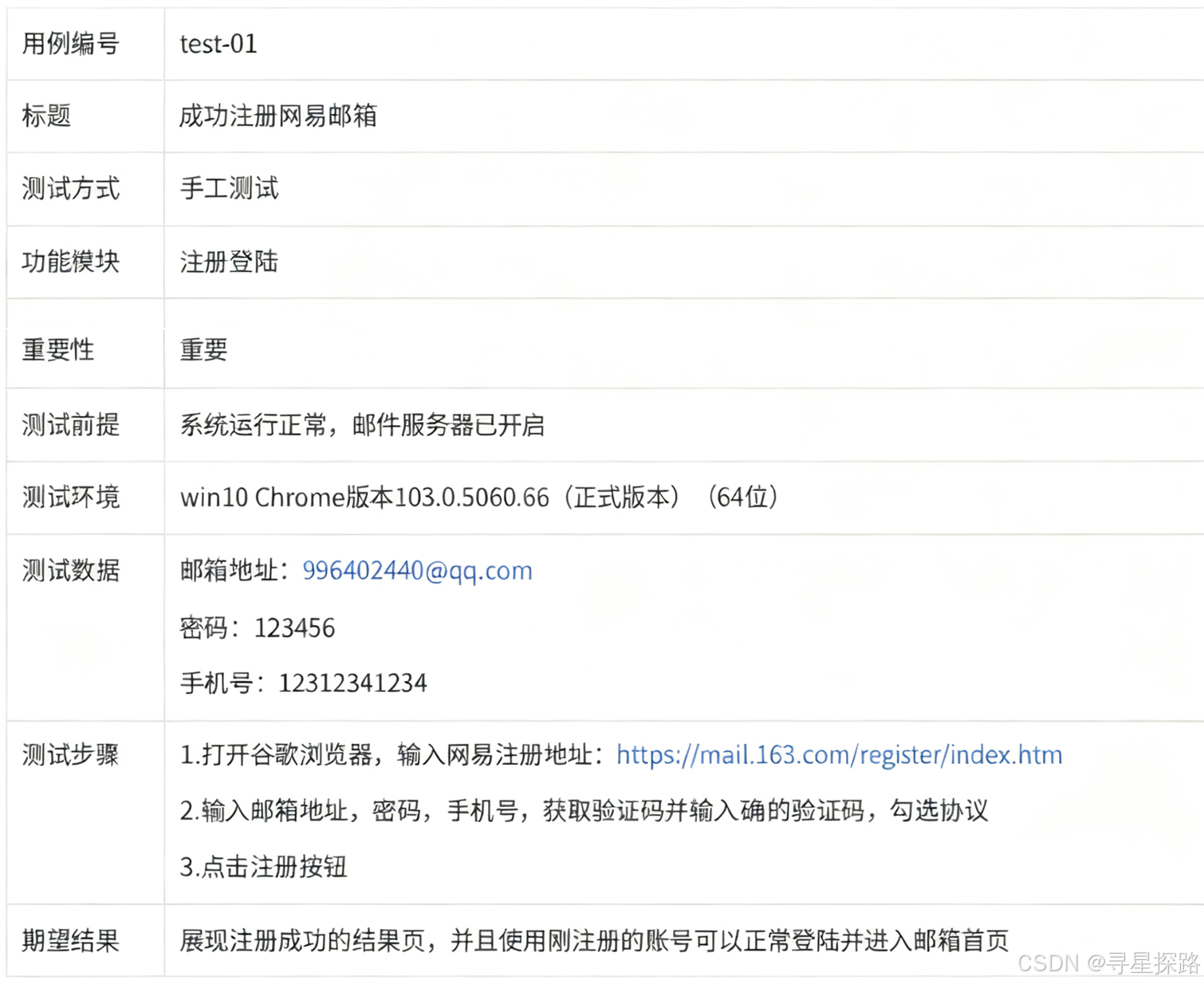 测试用例(TestCase)是为了实施测试而向被测试的系统提供的一组集合,这组集合包含:测试环境、操作步骤、测试数据、预期结果等要素。
