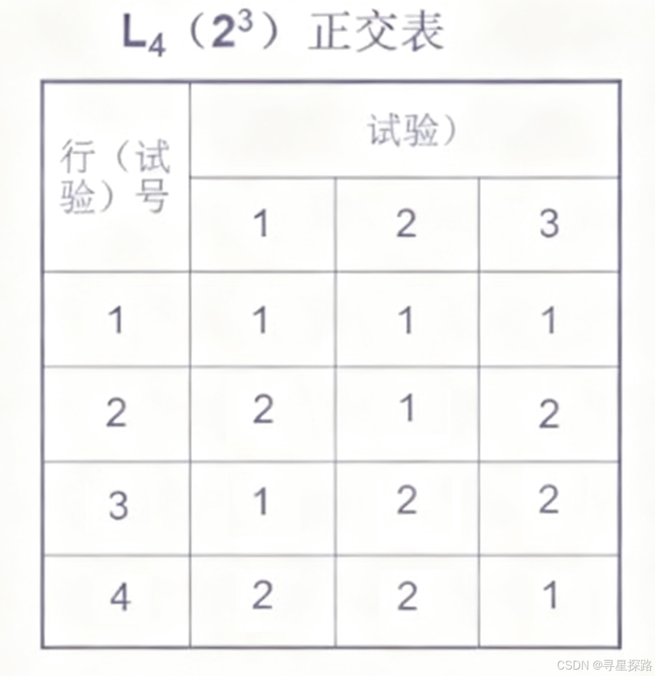 如图最简单的正交表是L(4)(2(3)),含意如下:“L”代表正交表;L下角的数字“4”表示有4横行, 简称行,即要做四次试验;括号内的指数“3”表示有3纵列,简称列,即最多允许安排的因素是3 个;括号内的数“2”表示表的主要部分只有2种数字,即因素有两种水平1与2。