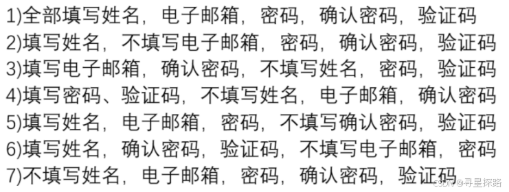 通过等价类和边界值方法我们完成了部分用例的补充 当前还剩下一个场景的用例未补充完成,“只填写部分选项”,这里到底要设计多少测试用例呢? 通常来说,为了保证系统的测试覆盖率,我们首先能够想到的就是排列组合。 假如当前有两个选项A和B,可以设计出都填写、都不填写、填写A、填写B四个测试用例(2²)。 假如当前有三个选项A、B、C,通过设计可以得到8个测试用例(2³) ...... 当前可选的选项是5个,分别是,姓名、电子邮箱、密码、确认密码、验证码。按照排列组合设计出来的用例是32个.....
