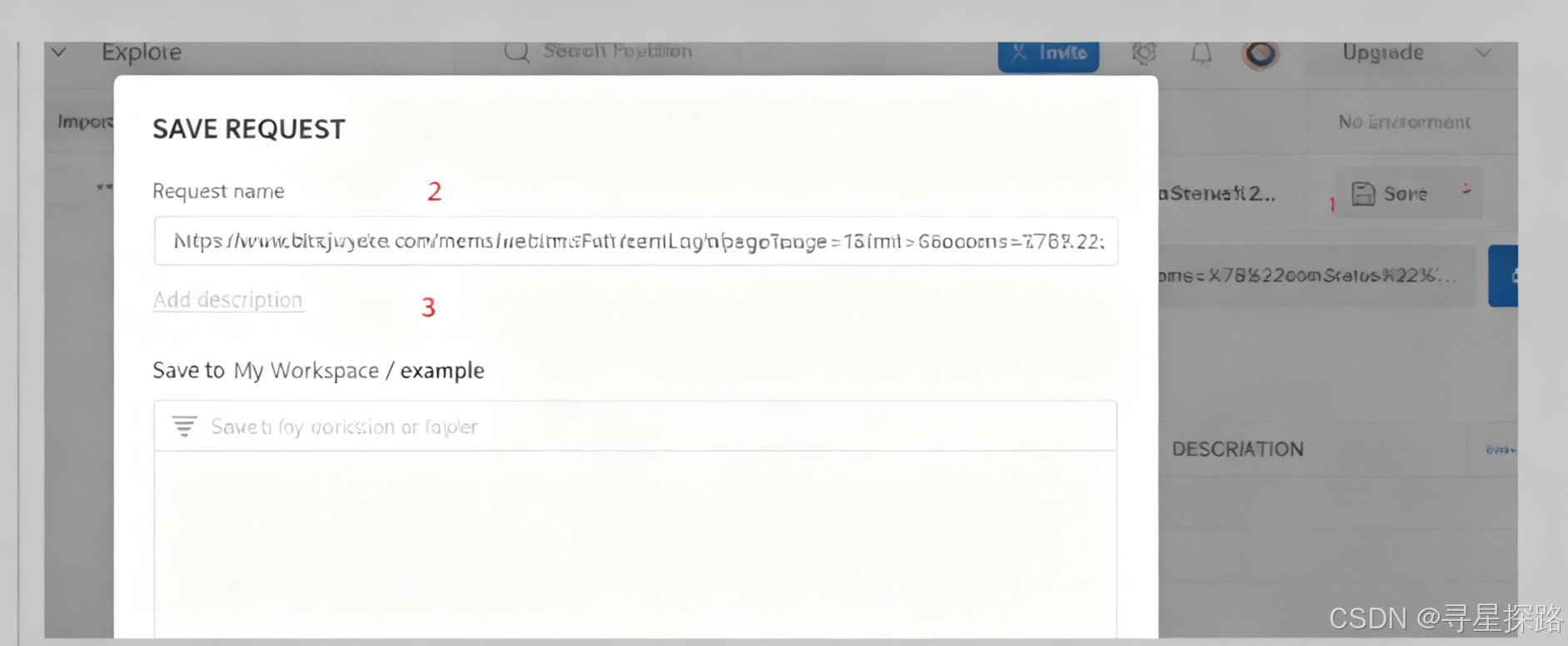 1.针对当前接口进行保存 2.选择保存的接口名称,可以自定义 3.选择想要保存的文件夹最终,当前文件会被保存到example文件夹中