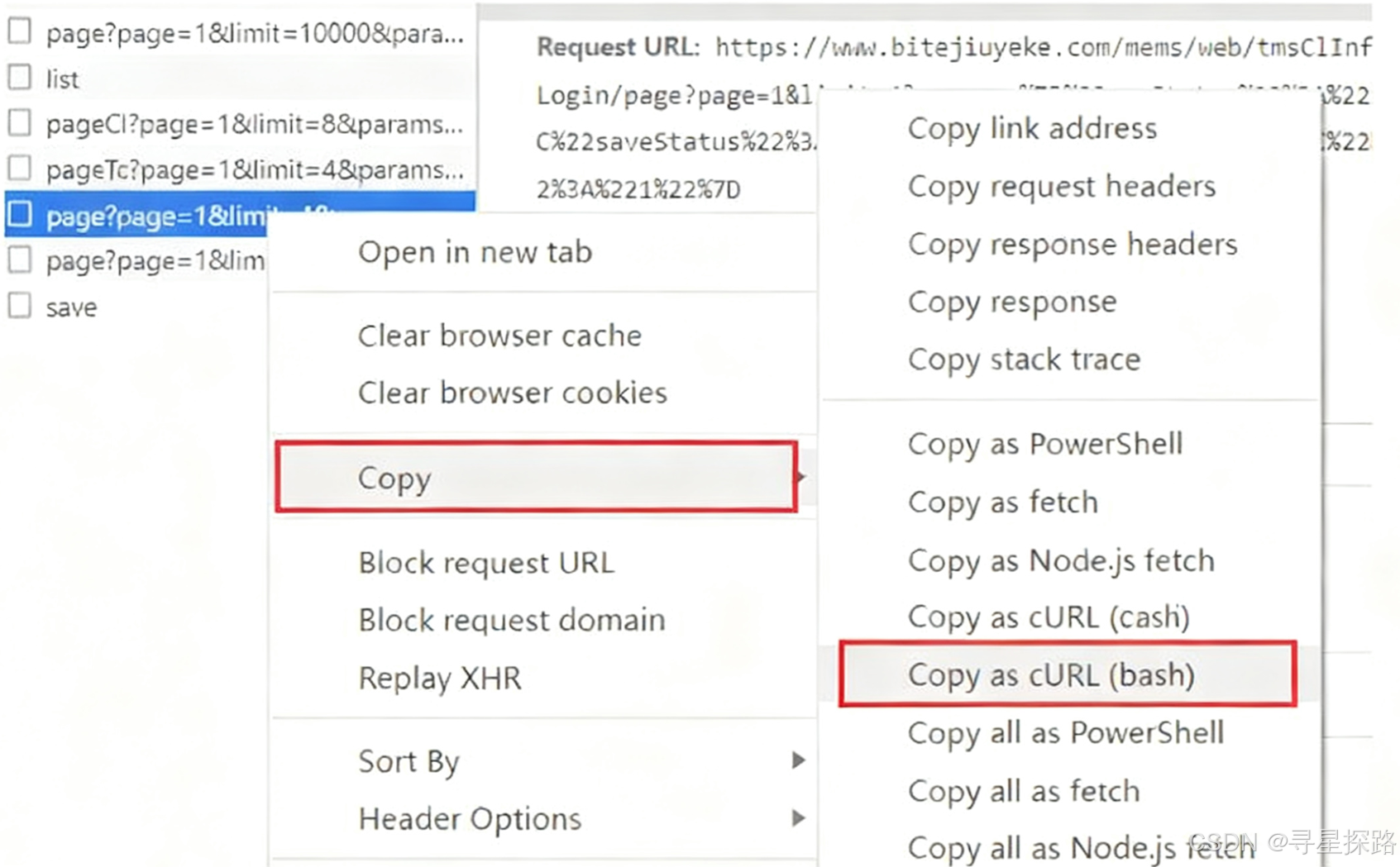 1)打开页面开发者工具,选中要复制的接口,右键复制URL