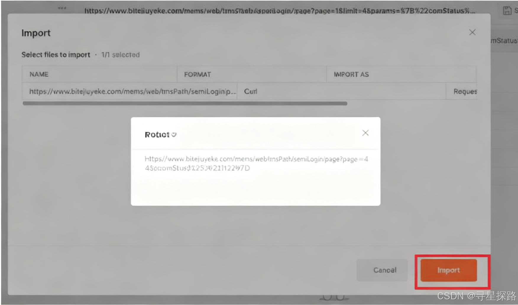 2)打开postman,点击“import”按钮,选择"Rawtext"方式导入请求,将复制好的URL粘贴到文本 框中,选择“continue”