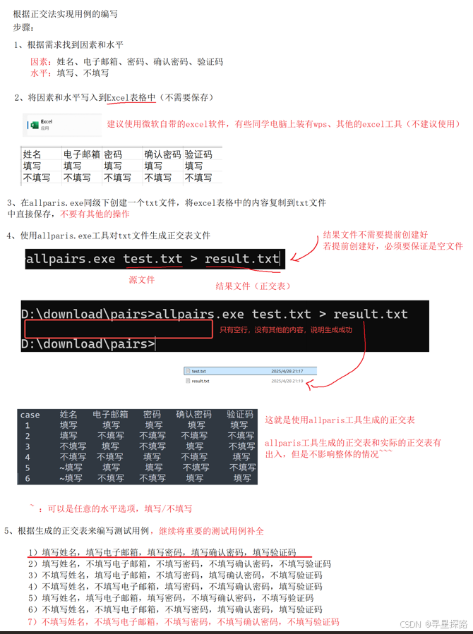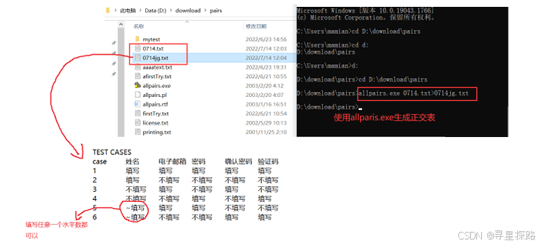1. 找到因素和水平 因素:姓名、电子邮箱、密码、确认密码、验证码 水平:填写、不填写 2. 用allparis工具生成正交表 a. 将因素和水平写入Excel表格中 b. allparis目录下创建新的文本文件0714.txt,复制Excel中的因素和水平,直接粘贴到文本中保存并退出 c. 使用allparis命令生成正交表:allparis.exe0714.txt>0714jg.txt(将生成的正交表数据放入 0714jg.txt文件中)