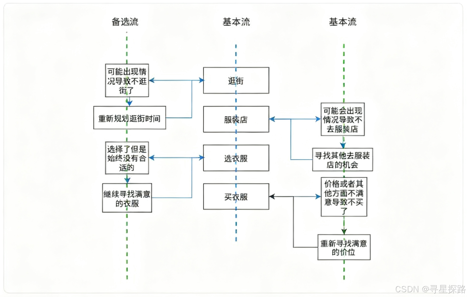读完上面的概念是不是⼀脸懵(懵就对了,因为我也看不懂,简单来说),场景法就是一个常规的流程中,某些阶段可能会出现一些意想不到的情况,常规流程是基本流,从阶段中分析出来的不同情况被称之为备选流,场景法比较考验同学们的发散思维。 针对场景法给出生活中的案例。以逛街买衣服为例,讲讲场景法的使用方法。