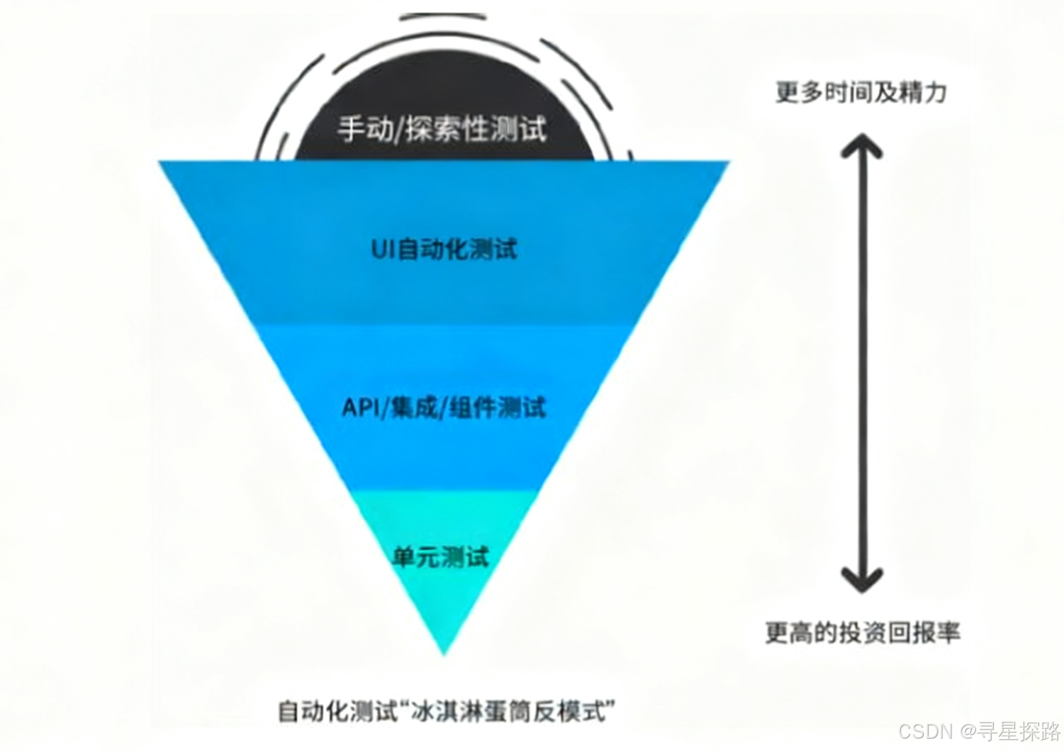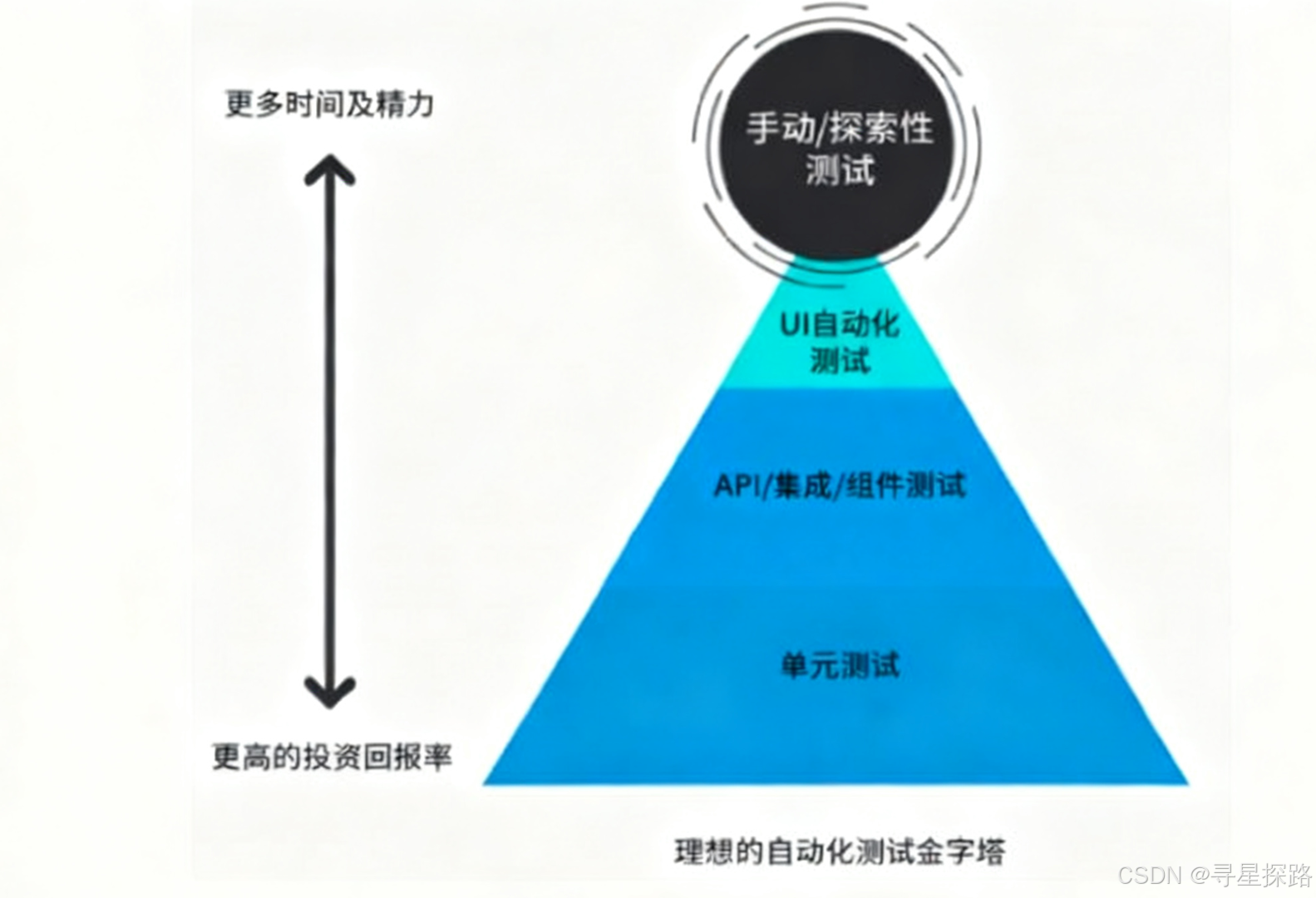 理想的自动化测试金字塔表达了自动化测试的理想情况,利用较少的时间和精力在单元测试上就能够发现更多有效的问题。
