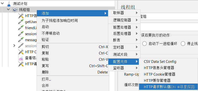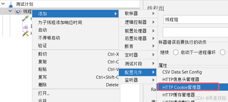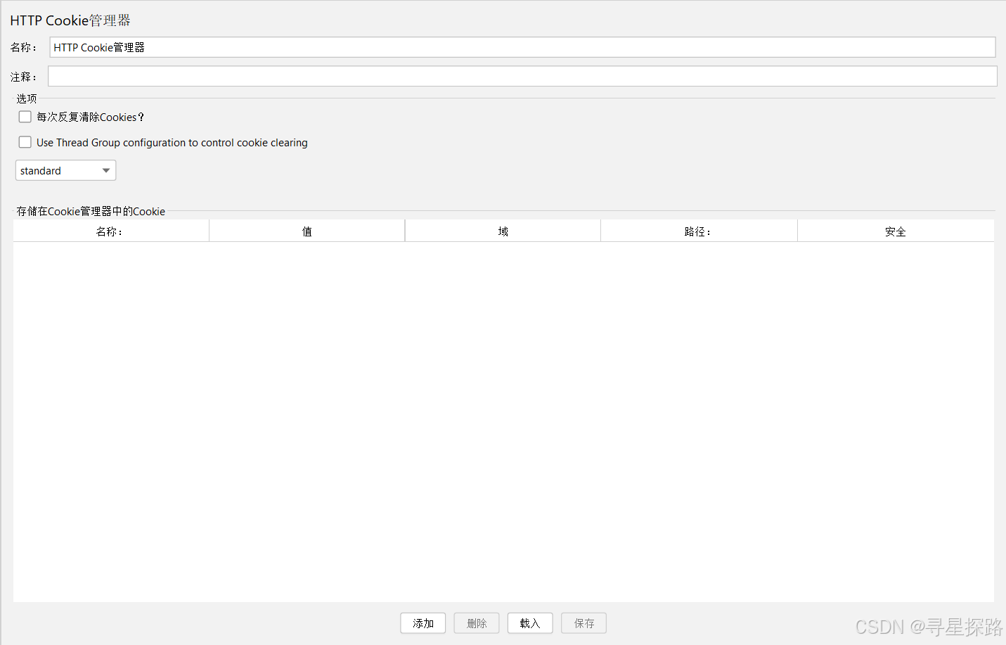 HTTP Cookie管理器像Web浏览器一样存储和发送Cookie。如果HTTP请求并且响应包含cookie,则 Cookie管理器会自动存储该cookie,并将其用于将来对该特定网站的所有请求。每个JMeter线程都有自己的"cookie存储区"。因此,正在测试使用cookie存储会话信息的网站,则每个JMeter线程都将拥有自己的会话。此类Cookie不会显示在Cookie管理器显示屏上,可以使用"查看结果树监听器"查看。 缓存配置可选择standard(标准)或compatibility(兼容的),当然也可以手工添加一些cookie。