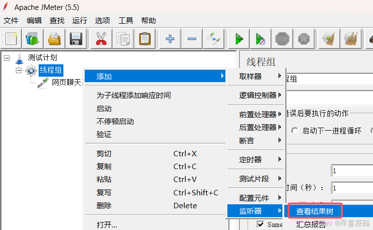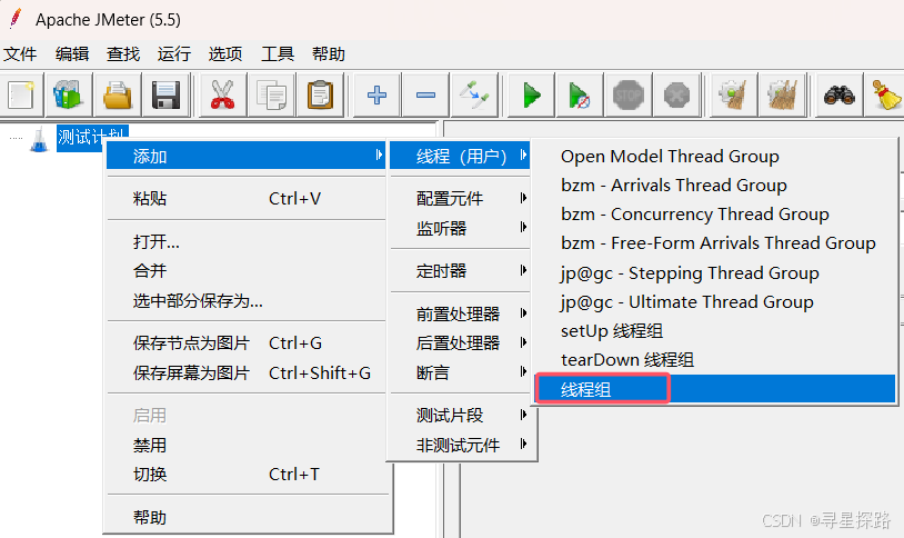 1)启动JMeter 2)在“测试计划”下添加“线程组”