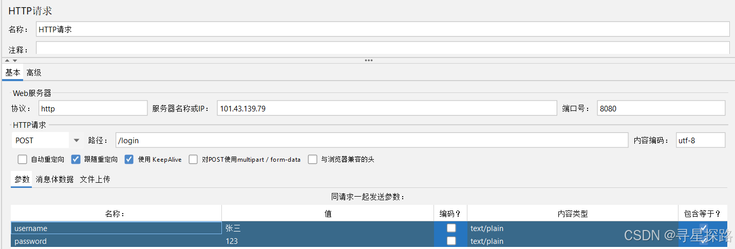 修改完该配置后,登陆接kou发起请求时将从csv文件中获取配置好的username和password参数,获取顺序为从上往下依次获取