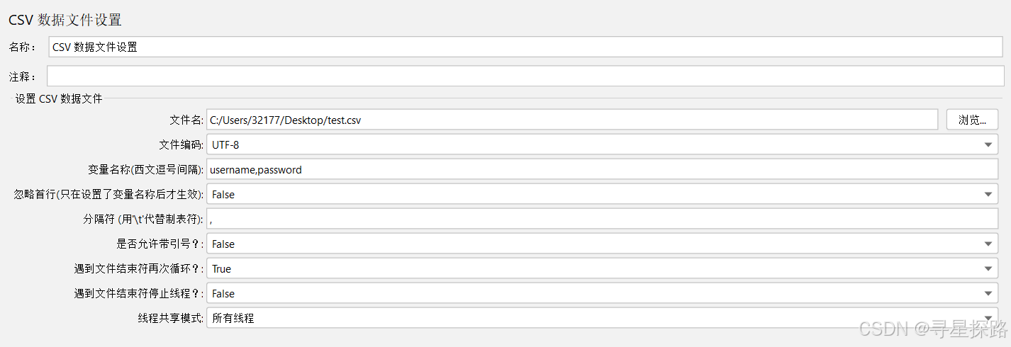 添加方式:线程组⸺配置元件⸺CSV数据文件设置