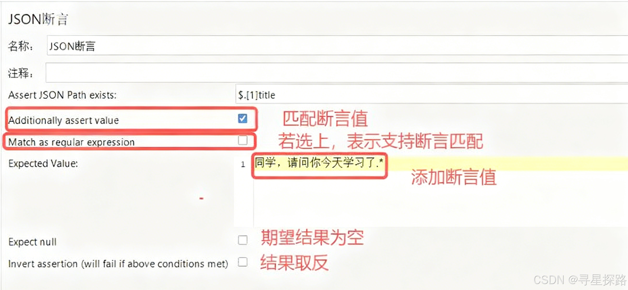 注意: 1)若不选Additionally assert value,表示添加断言值,则可用来判断字段是否存在 2)选择Additionally assert value,则必须添加ExpectedValue期望的断言值 3)若不选Match as regular expression正则匹配,则Expected Value必须填写完整,少一个字符都会导致断言失败 4)若选择Match as regular expression正则匹配,则Expected Value可以仅写上部分关键词即可断言成功