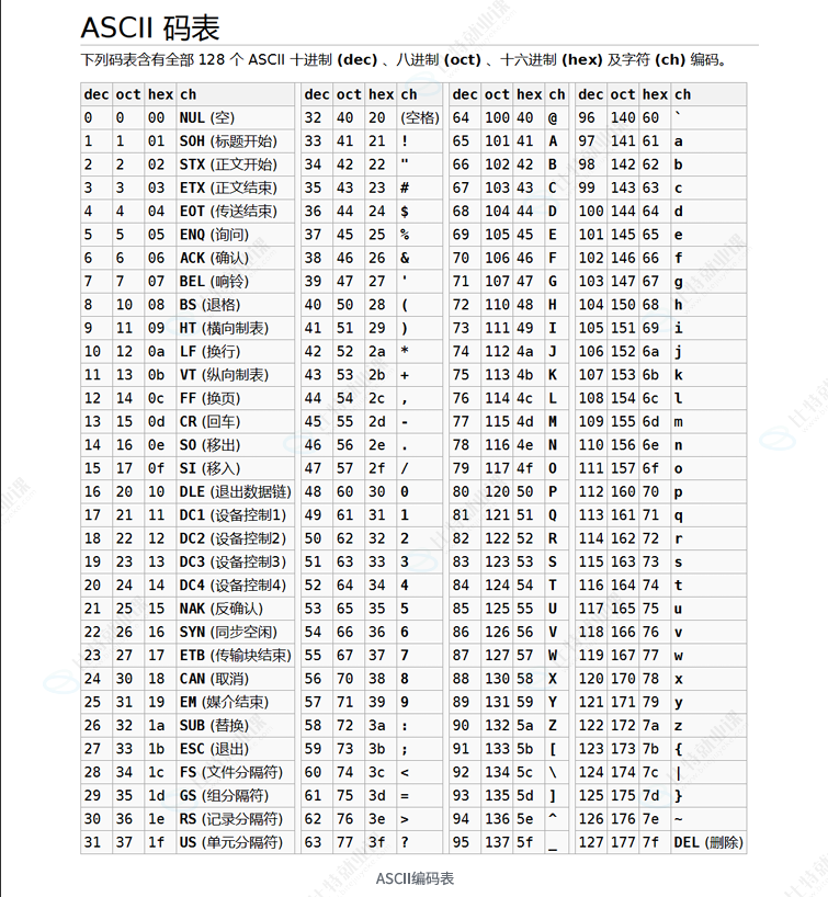 6、在这些字符中ASCII码值从0~31这32个字符是不可打印字符,⽆法打印在屏幕上观察