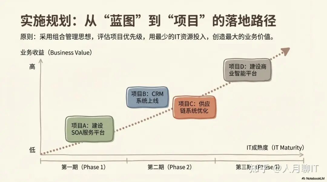 实施规划要考虑:建设哪些IT系统、如何分阶段建设、如何支撑业务流程、IT系统建设的协同关系、如何推进系统建设、如何减少重复建设等关键信息。