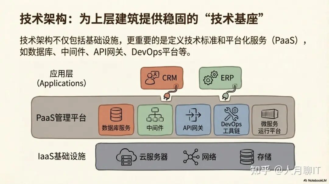 技术架构描述企业开发、实施和管理应用系统和数据所需的IT技术体系和IT基础设施。传统技术架构规划偏向IT基础设施设计,而融入云计算和SOA思想后,技术平台都应划归技术架构规划,包括企业私有云PaaS平台、云原生解决方案的平台层能力(IaaS资源层和PaaS服务层)等。
