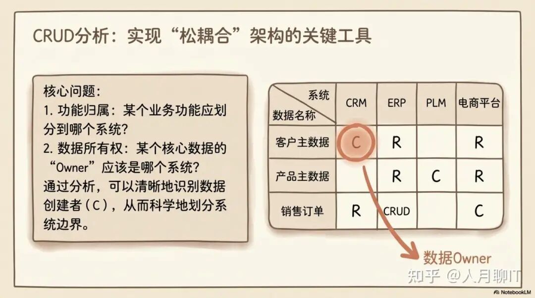应用架构规划的关键是CRUD矩阵分析,解决两个问题:某个业务功能究竟划分到哪个系统更能实现松耦合;某个数据对象的Owner究竟属于哪个系统能实现松耦合。当前很多企业实施微服务后出现大量接口网状调用,导致模块间耦合更紧,就是因为拆分时没做好CRUD分析。