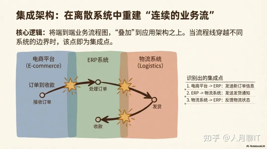 集成架构的核心逻辑:企业业务流程本身是端到端连贯的,但应用架构设计时将应用拆分为多个系统实现,每个系统实现业务流程的某一部分。业务连贯但实现割裂,因此业务系统必须高效协同才能完成端到端流程。